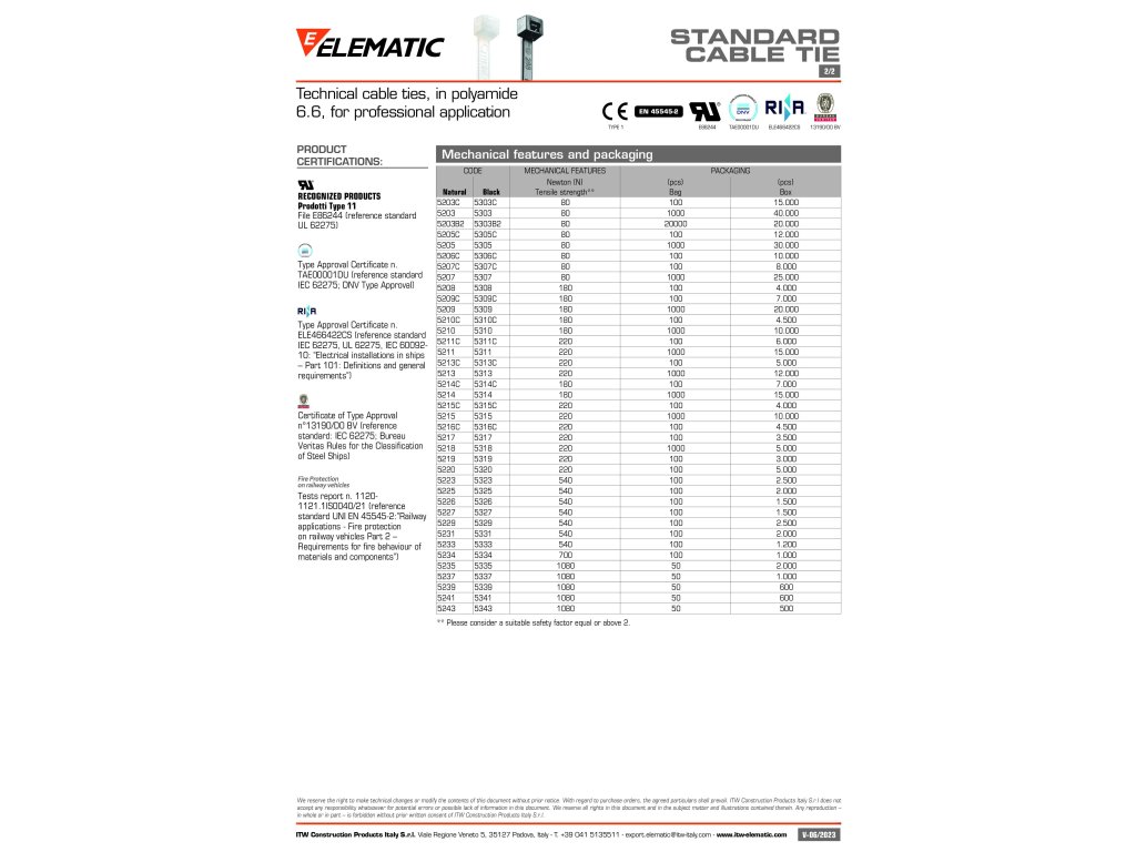 Pásky jsou testovány v souladu s CEI EN IEC 62275 „Cable management system – Cable ties for electrical installations“ (ČSN EN IEC 62275 Systémy vedení kabelů - Stahovací pásky na kabely pro elektrické instalace).