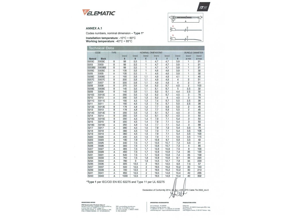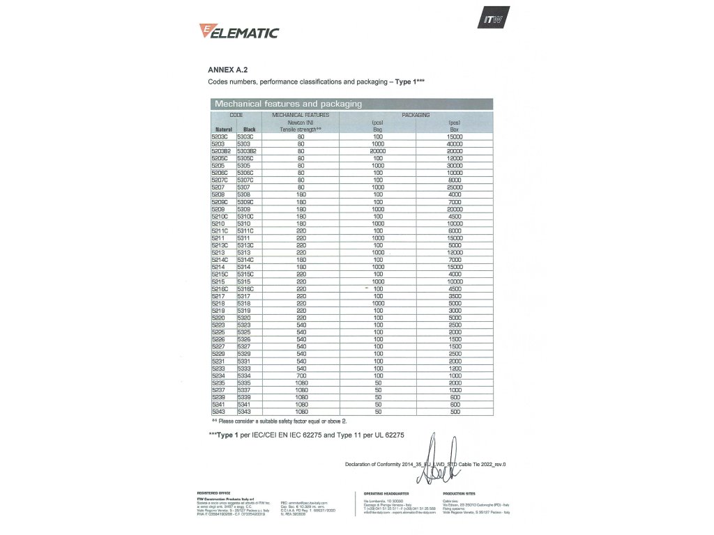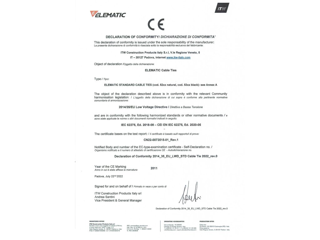 Pásky jsou testovány v souladu s CEI EN IEC 62275 „Cable management system – Cable ties for electrical installations“ (ČSN EN IEC 62275 Systémy vedení kabelů - Stahovací pásky na kabely pro elektrické instalace).